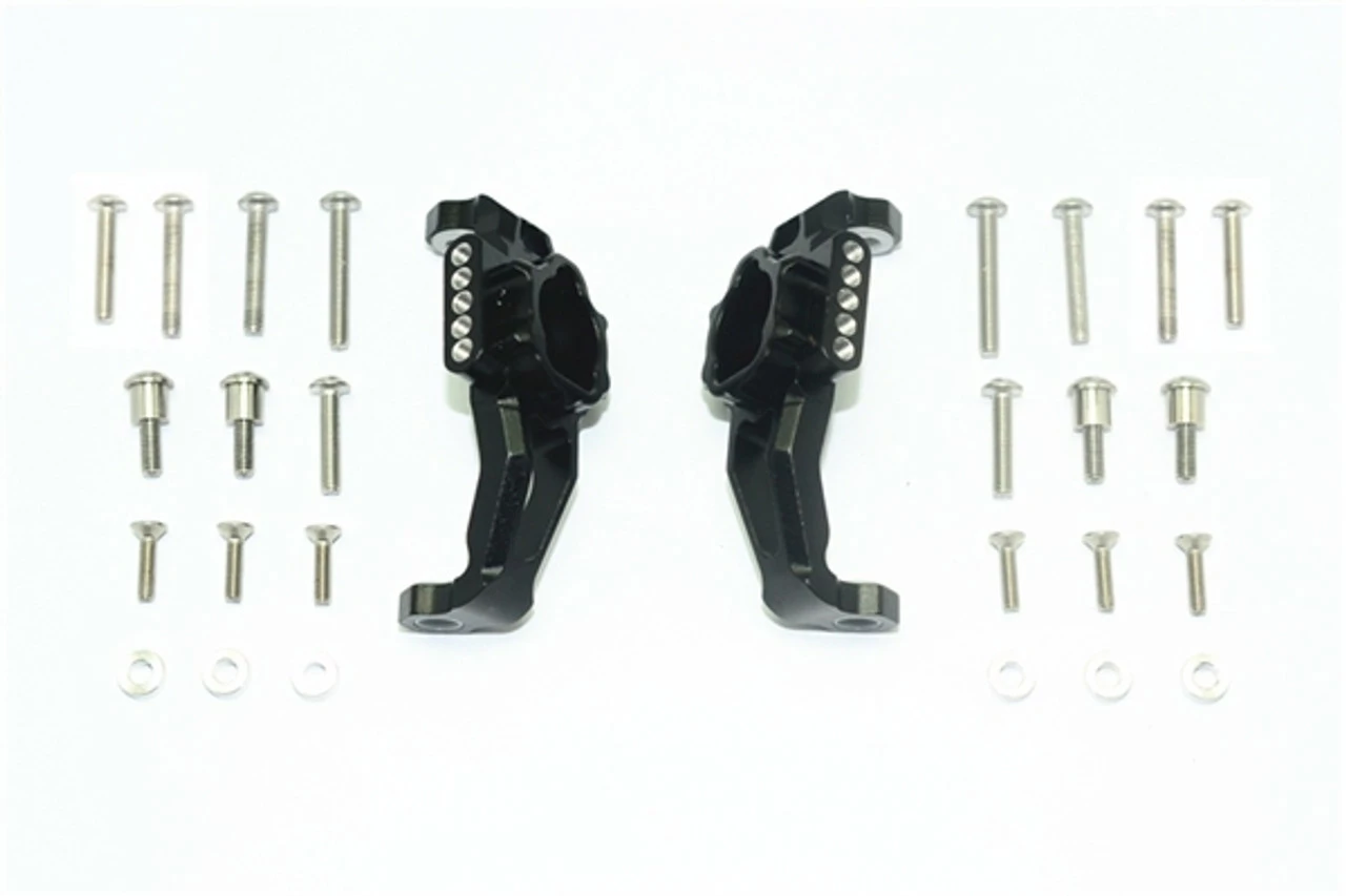 These are the GPM Racing Black Aluminum Adjustable Front Portal Drive Caster Blocks for Traxxas TRX-4 scale trucks and rock crawlers. Made of 6061-T6 aluminum, these are durable and look great. The multiple mounting holes on these allow for mounting the shocks at different positions. Stainless steel kingpins and mounting screws are also included.