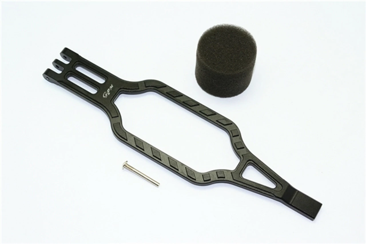 This is the GPM Racing Black Aluminum Battery Hold Down for the Traxxas TRX-4 scale crawlers and the 4-Tec 2.0 cars. Made of 6061-T6 aluminum with an anodized finish, these look great. Unlike the stock straight battery hold down, these feature an opening to allow running 7-cell hump pack batteries if you want to run those as well.