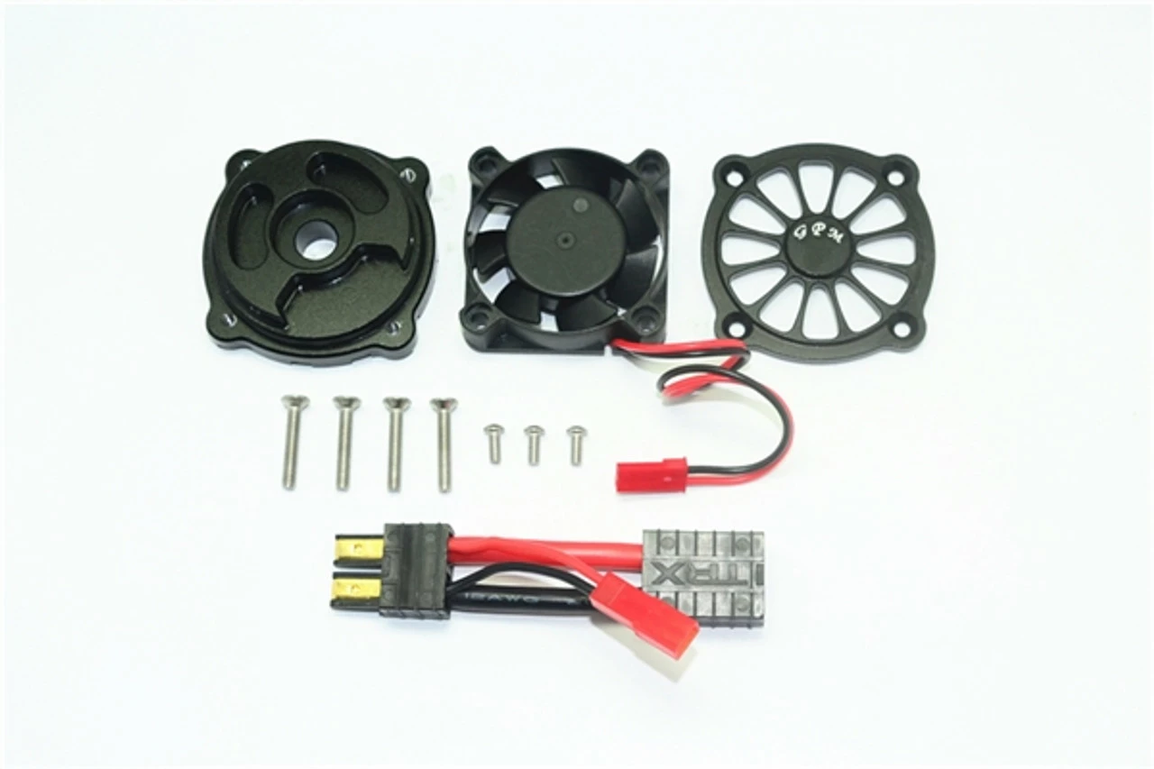 This is the GPM Racing Black Aluminum Motor Heatsink Cooling Fan for Traxxas Unlimited Desert Racer trucks. Made of 6061-T6 aluminum with a fan tucked between, this innovative design helps pull heat from the motor for improved motor life. They look great installed with an anodized color finish. Installation is simple as well, with a wire jumper included to provide power to the fan.