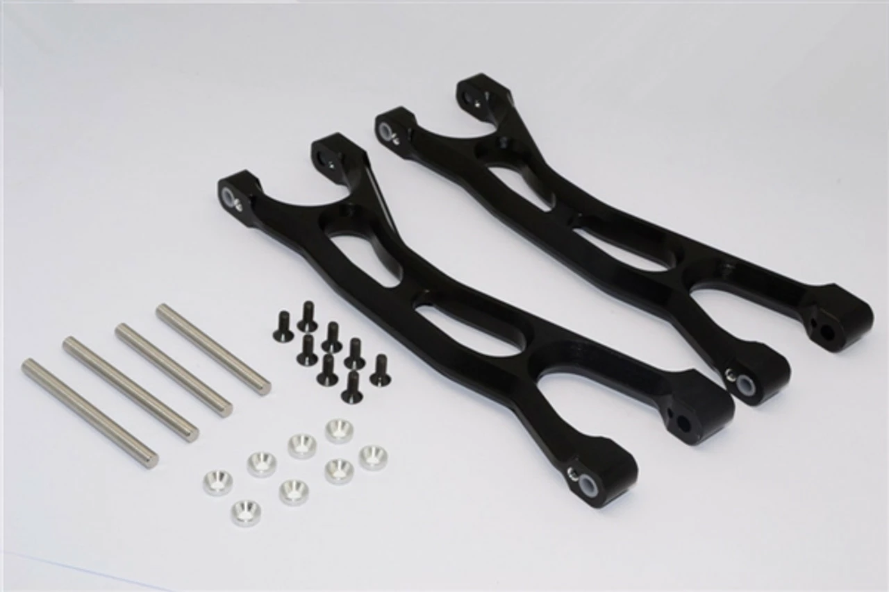 These are the GPM Racing Black Aluminum Upper Suspension Arms (front or rear) for Traxxas X-Maxx trucks. Each pack includes one pair of arms, which can be used on the front or rear of the truck. Made of 6061-T6 aluminum with an anodized finish, these are durable and look great installed. These feature delrin hinge pin bushings to eliminate any metal on metal friction. Hinge pins and mounting hardware are included.