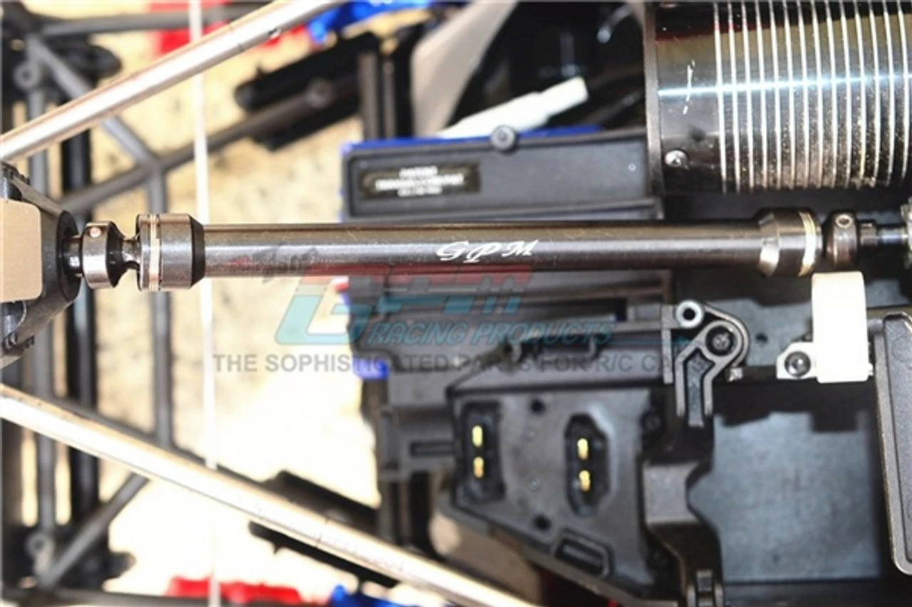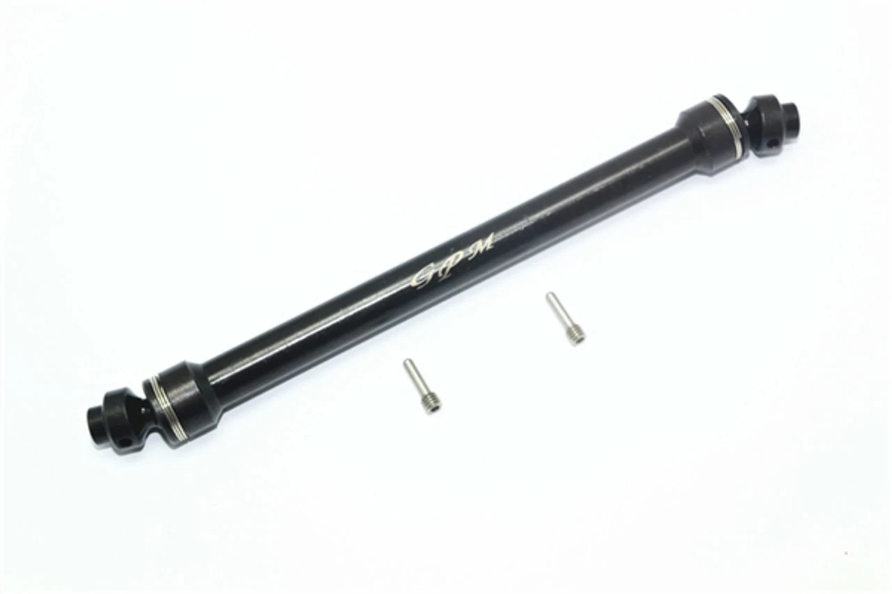 This is the GPM Racing Black Hardened Steel Center Rear Driveshaft for Traxxas Unlimited Desert Racer trucks. Made of #45 hardened steel, these are thicker than stock for extreme durability.