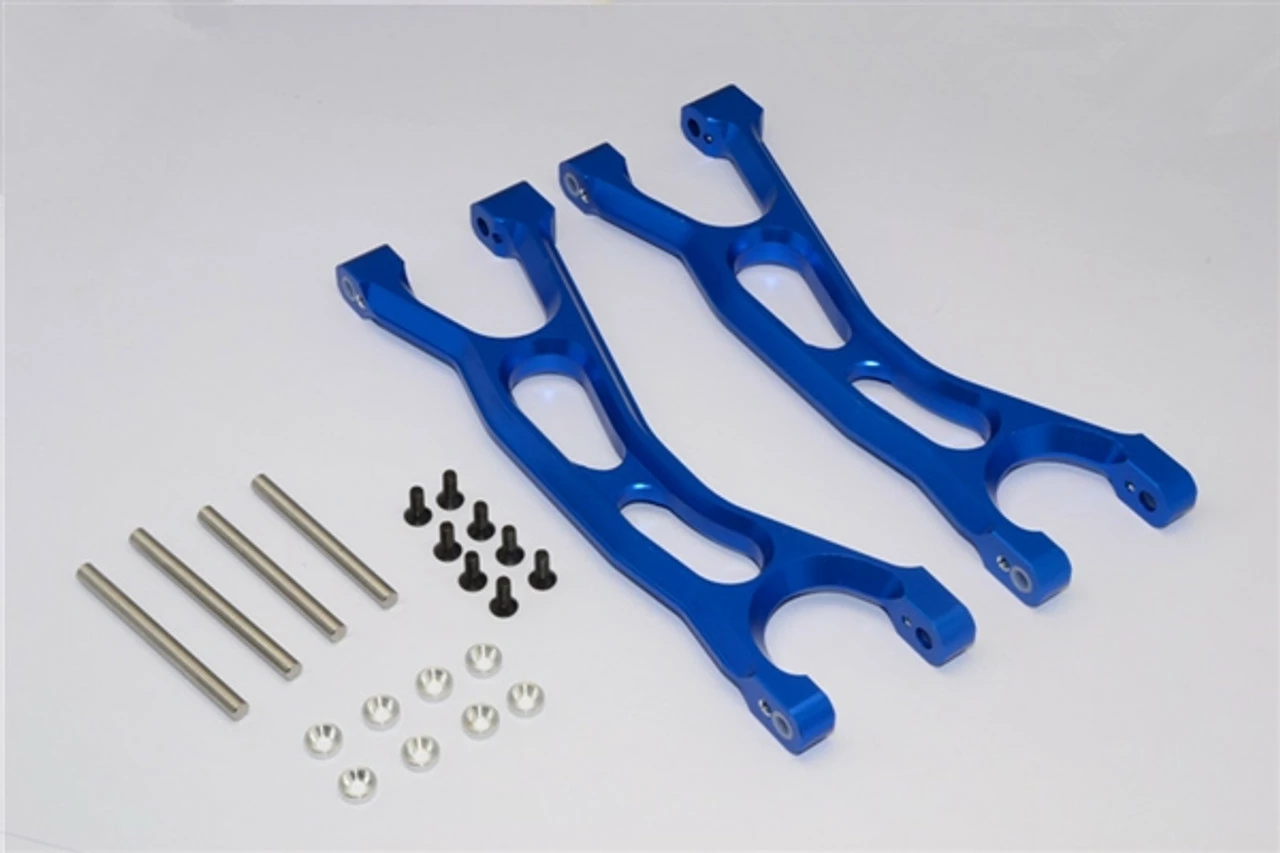 These are the GPM Racing Blue Aluminum Upper Suspension Arms (front or rear) for Traxxas X-Maxx trucks. Each pack includes one pair of arms, which can be used on the front or rear of the truck. Made of 6061-T6 aluminum with an anodized finish, these are durable and look great installed. These feature delrin hinge pin bushings to eliminate any metal on metal friction. Hinge pins and mounting hardware are included.