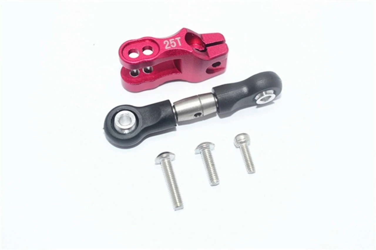 This is the GPM Racing Red Aluminum 25T Spline Servo Horn with Stainless Steel Adjustable Linkage for Traxxas Unlimited Desert Racer trucks. The servo arm itself is held onto the shaft with a screw into the shaft, as well as a clamping screw, for a solid grip on the output shaft.