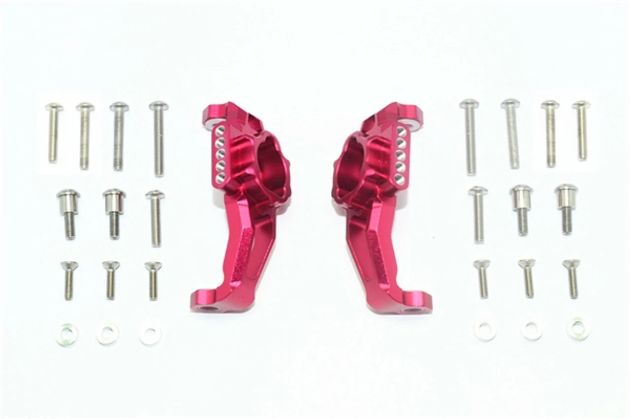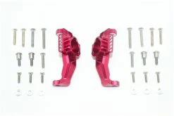 These are the GPM Racing Red Aluminum Adjustable Front Portal Drive Caster Blocks for Traxxas TRX-4 scale trucks and rock crawlers. Made of 6061-T6 aluminum, these are durable and look great. The multiple mounting holes on these allow for mounting the shocks at different positions. Stainless steel kingpins and mounting screws are also included.
