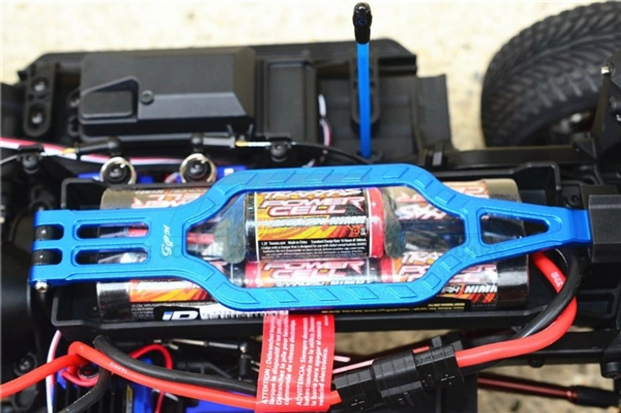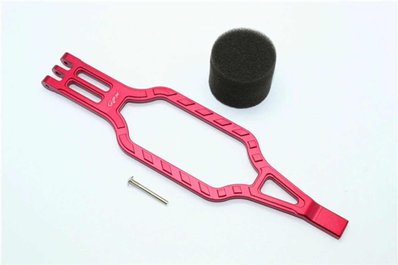 This is the GPM Racing Red Aluminum Battery Hold Down for the Traxxas TRX-4 scale crawlers and the 4-Tec 2.0 cars. Made of 6061-T6 aluminum with an anodized finish, these look great. Unlike the stock straight battery hold down, these feature an opening to allow running 7-cell hump pack batteries if you want to run those as well.