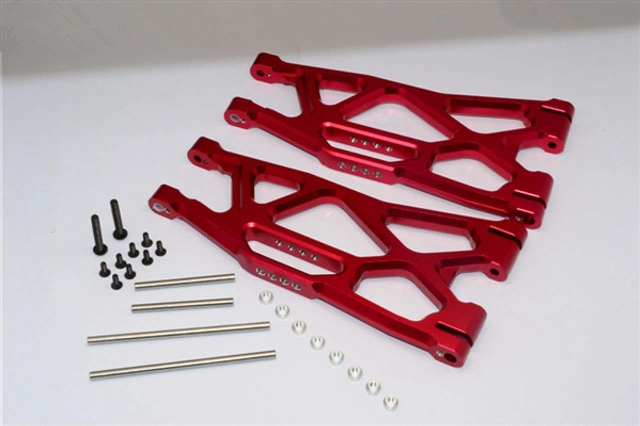 These are the GPM Racing Red Aluminum Lower Suspension Arms (front or rear) for Traxxas X-Maxx trucks. Each pack includes one pair of arms, which can be used on the front or rear of the truck. Made of 6061-T6 aluminum with an anodized finish, these are durable and look great installed. These feature delrin hinge pin bushings to eliminate any metal on metal friction. Hinge pins and mounting hardware are included.