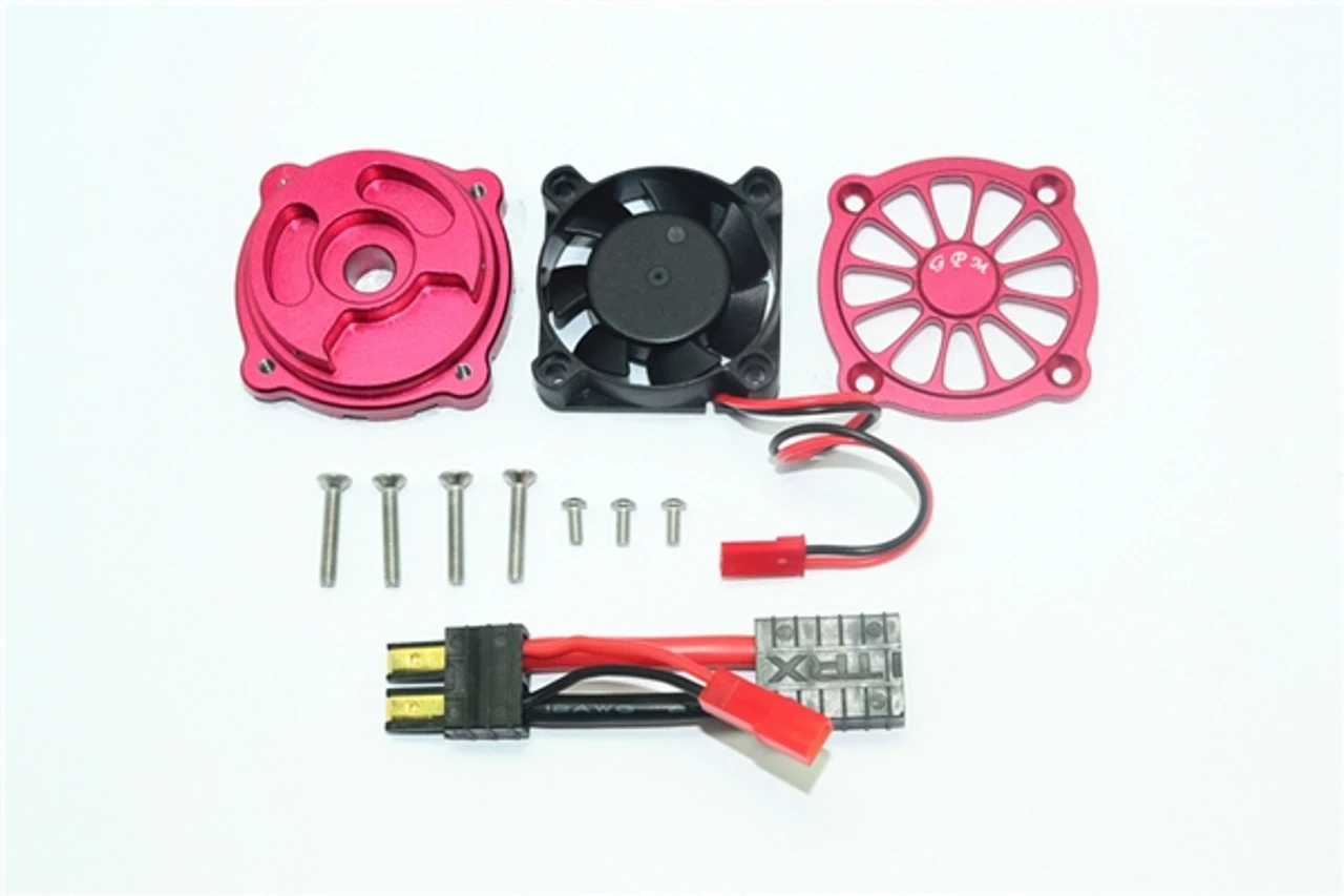 This is the GPM Racing Red Aluminum Motor Heatsink Cooling Fan for Traxxas Unlimited Desert Racer trucks. Made of 6061-T6 aluminum with a fan tucked between, this innovative design helps pull heat from the motor for improved motor life. They look great installed with an anodized color finish. Installation is simple as well, with a wire jumper included to provide power to the fan.