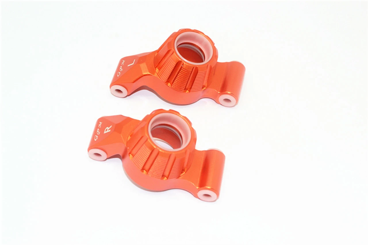 These are the GPM Orange Aluminum Rear Stub Axle Carriers for the Traxxas 1/10 Maxx 4S truck. Made of 6061 T6 aluminum with an anodized finish, these look great and hold up under extreme bashing!