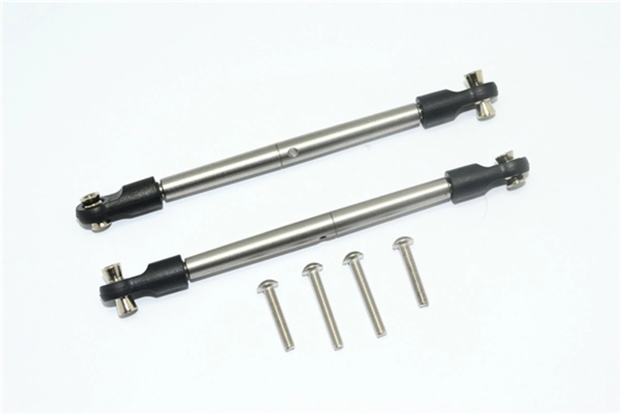 These are the GPM Racing Stainless Steel Front Steering Toe Link Turnbuckles with Rod Ends for Traxxas Unlimited Desert Racer trucks. Made of 304 stainless steel, these are much stronger than the stock plastic links. The turnbuckle design also allows for precise adjustments of the toe-in on the truck. These are ready to install, including new stainless steel mounting screws.