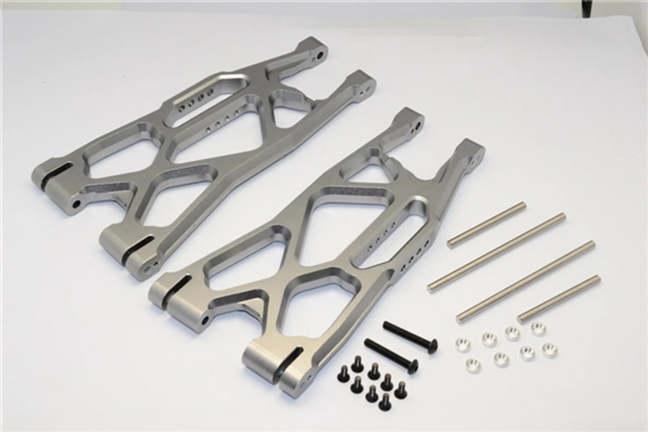 These are the GPM Racing Gunmetal Aluminum Lower Suspension Arms (front or rear) for Traxxas X-Maxx trucks. Each pack includes one pair of arms, which can be used on the front or rear of the truck. Made of 6061-T6 aluminum with an anodized finish, these are durable and look great installed. These feature delrin hinge pin bushings to eliminate any metal on metal friction. Hinge pins and mounting hardware are included.