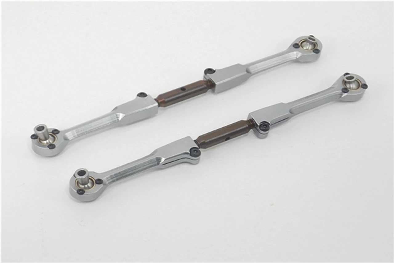 These are the GPM Racing Spring Steel Adjustable Steering Toe Links with Gunmetal Aluminum Rod Ends for Traxxas X-Maxx trucks. With 6061-T6 aluminum rod ends, and spring steel center turnbuckle links, this set enables fine-tuning of the toe-in settings on the truck. They look great too!