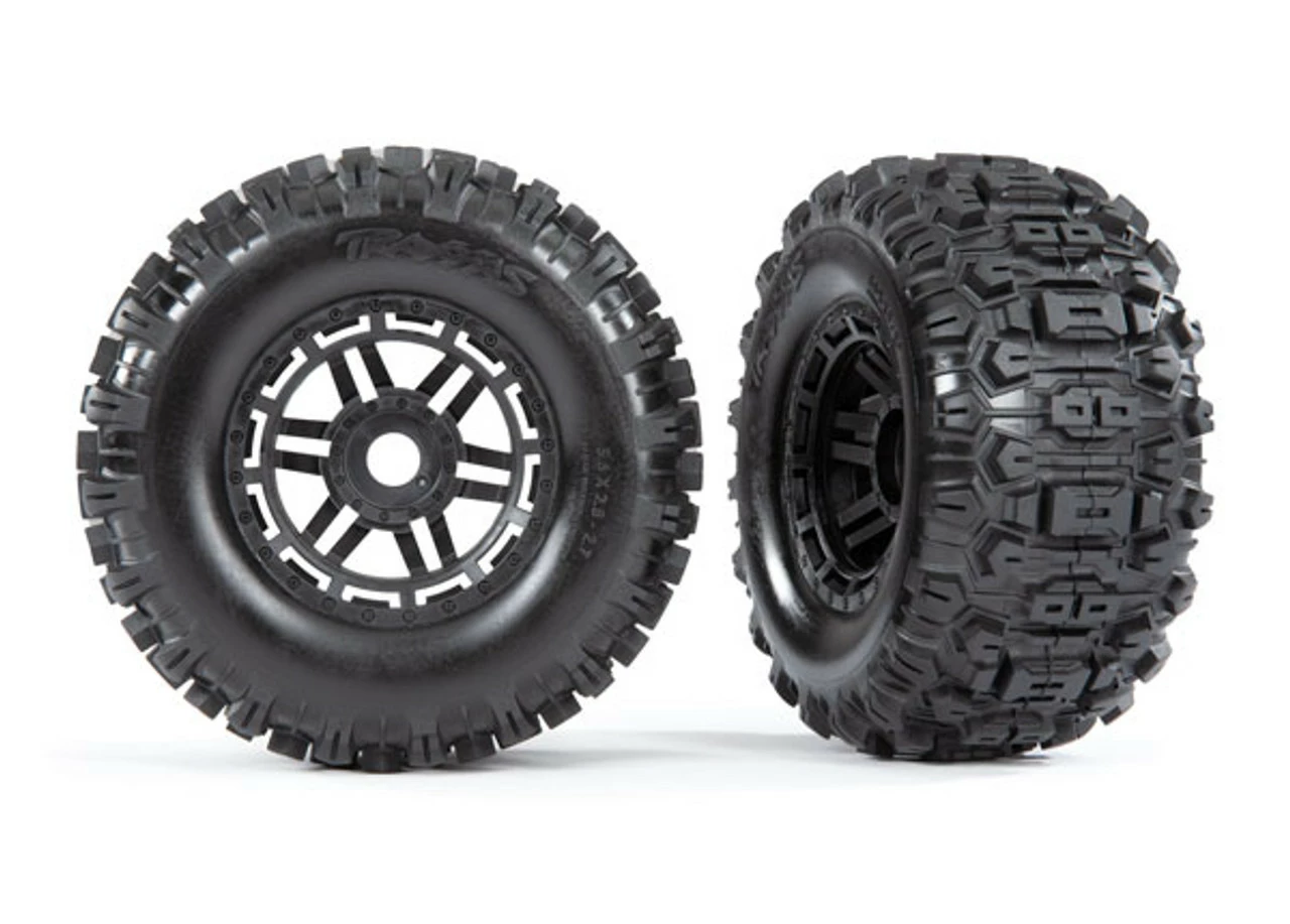 This is the Traxxas Maxx 4S Sledgehammer Tires on Black Wheels 17mm Splined Hex (2)